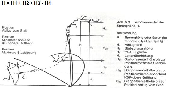 Die folgende Abbildung zeigt eine Unterteilung der Sprunghöhe in 4 Teilhöhen. Die Sprunglattenhöhe H wird differenziert in Absprunghöhe H1, Stabphasenhöhe H2, vom Stab erzielte freie Flughöhe H3 und in die Lattenüberhöhung H4. Die Summe der Teilhöhen ergibt die Sprunghöhe H.